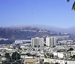 In the 1960s, famed real estate developer Joseph Eichler build two towers called Geneva Towers using federal aid designed to fund affordable rental housing for middle-incomers. Vice President Hubert Humphrey was present for the dedication of the towers in 1965. In 1967, Eichler ran into financial trouble and the Geneva Towers went into receivership. The Housing Authority of San Francisco eventually took over the management and turned the towers into rentals for Section 8 tenants.[9] The towers suffered through dilapidation and poor maintenance throughout the 1980s and were plagued by gangs and drug activity.[28] The City ordered the destruction of the buildings in 1998[29] and replaced them with lower-density units.[30]