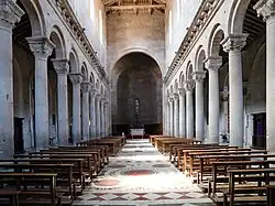The renovations of the cathedral along the centuries eliminated most of the original frescoes. The main works along apse are 18th-century pieces by the local painter Giovanni Francesco Romanelli and contemporaries. Only two notable early artworks survive, a Redentore benedicte (Christ giving a blessing) (1472) attributed to Gerolamo da Cremona[2] and a 12th-century Madonna and Child by an unknown artist; the work appears to be an earlier version of a famous painting in the Basilica di Santa Maria Maggiore in Rome. It has been moved here from a local parish church. The cathedral also possesses a baptismal font (1470) constructed initially by Francesco da Ancona with later additions.