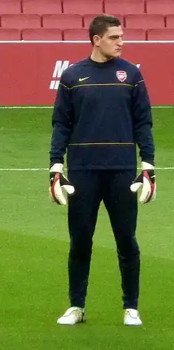 Born in Desio, Lombardy, from Sicilian parents,[3] Mannone was signed by Arsène Wenger during the summer of 2005, joining Arsenal from Atalanta on a three-year deal for a £350,000 compensation fee.[4][5][6] He made his Arsenal debut in a pre-season friendly against Barnet on 16 July 2005, as Arsenal ran out 4–1 winners.