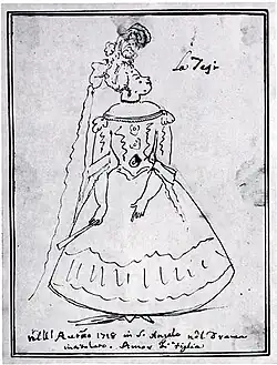 Notwithstanding, it was in fact as a 'singer-actress' — to put it in modern terms — that she went down in history: "the first 'divina' in the contralto clef", as she has been recently called.[11] According to Stefano Arteaga and the aforementioned Mancini, in particular, who both wrote around the time of her death, she was the century's greatest operatic actress,[12] and her theatrical skills, either natural or acquired through hard study and training, were such that no other actress could ever emerge on the opera stage to surpass or even just equal her.[10]