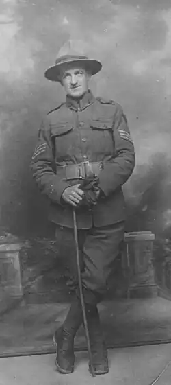 He fought in the Second Boer War,[3] and enlisted to fight in World War I. He was killed in action on the Ypres Salient, and is buried at the Prowse Point War Cemetery.[4]