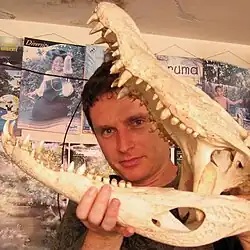 - In 2005-2013 Dinets conducted a comparative study of social behavior of Crocodilians, working in 26 countries.[6] In 2005 he discovered "alligator dances".[14] By 2010 he elucidated the roles of many signals used by Crocodilians,[15] and proposed their possible evolutionary history.[16] In 2009-2013 he documented the ability of crocodiles and alligators to use coordination and role separation during cooperative hunting[17] and to use sticks as lures for hunting birds looking for nesting material.[18] He also conducted the first scientific studies of play behavior in crocodilians and on coordinated hunting in snakes.