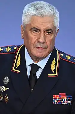 Vladimir Alexandrovich Kolokoltsev (Russian: Влади́мир Алекса́ндрович Колоко́льцев; born 11 May 1961) is a Russian politician and police officer who was the Moscow Police Commissioner from 2009 to 2012. He has been Russian Minister of Internal Affairs since 21 May 2012.
