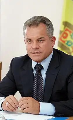 Vladimir Plahotniuc (born 1 January 1966), commonly referred to as Vlad Plahotniuc, is a Moldovan politician and oligarch and was the vice president of the parliament of Moldova from 2010 to 2013.[6] He was the chairman of the Democratic Party of Moldova (24 December 2016 – 24 June 2019) and previously was a member of the Parliament of Moldova for three terms (December 2010 – October 2013, December 2014 – July 2015, February 2019 – July 2019), and served as First Vice President of the Parliament of Moldova (December 2010 – February 2013). Until leaving the territory of the Republic of Moldova in 2019,[7][8] he was considered to be the powerhouse of Moldovan politics in matters of influence,[9] controlling Moldova's government and parliamentary majority.[10][11][12] From his flight from Moldova in June 2019 to 2025, Plahotniuc resided in Turkey.[13]