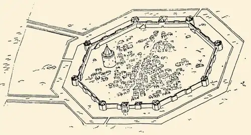 The castle had an octagonal shape. Each wall was around 100 metres long, which means that the castle occupied a surface of around 3.5-4ha. Each of the corners had a hexagonal bastion. Overall the castle had 2 gates which were secured by drawbridges as the walls were surrounded by water. The wall that faced the seas was accompanied by a tower to secure the castle against any amphibious landings. It housed a garrison of several hundred soldiers.[1]