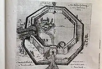 No photographs of the castle exist, its appearance has only been described or documented through drawings.[1] Up until at least the 1930's the outline of the castle is visible on old aerial photographs.[7] Today the Flamurtari Stadium occupies most of the site of the former castle.[1]
