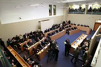 Assemblies are elected for a five-year term during nationwide local elections. Similar to nationwide elections for Sejm members, councillors for provincial assemblies are elected from party lists using proportional representation within a five percent voting threshold for each individual voivodeship.[7] Following their election and swearing-in, the councillors of an assembly elect a voivodeship marshal (marszałek województwa) and at most two vice-marshals from among their ranks, who, along with normally two other members, will form an executive board (zarząd województwa).[8] The board acts as the collective executive body of the voivodeship, and is the province's de facto cabinet.[9] The assembly additionally elects a chairman and deputy chairmen from among their ranks, who are tasked in organizing the assembly's business and presiding over debates.[10] If the assembly fails to elect an executive board within three months following an election, the legislature must dissolve itself and the voivodeship is obliged to call another election.[11] Earlier elections can also be approved in the event of a public referendum or if the Sejm has dissolved a regional assembly.[12]