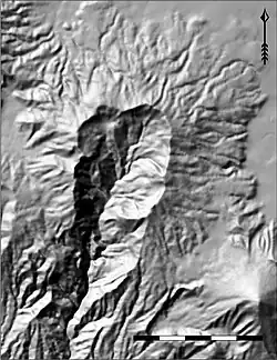 ![]() Relief map of Volcán Siete Orejas with Volcán Santa Maria to the SE. (Unit of scale bar is 1 km per section) | |