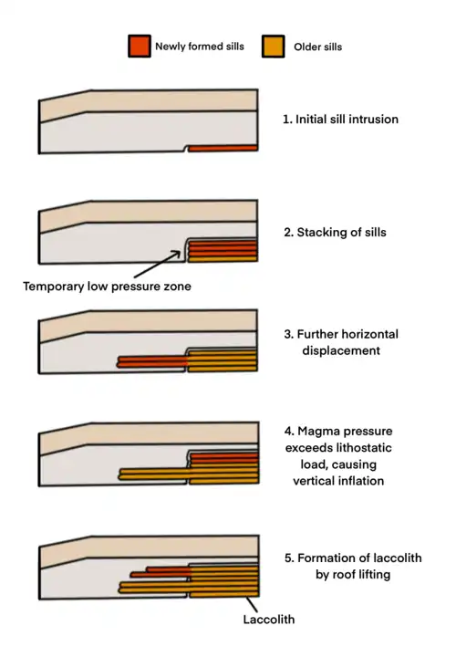 The formation of laccolith is governed by the jointing and faulting of the country rocks when emplacement begins.[28] These lines of weakness provide pathways for the formation of initial sill-like structures that are horizontal in shape.[28] At this stage, sheet intrusion is a more favourable mechanism of emplacement because the margins of the sheet cool faster, which creates shear zones that allow further horizontal displacement.[29] After some time, when the cooling rate decreases, and when the sills continue to stack onto one another, sheet intrusion is no longer a favourable mechanism because the zones of weakness diminish.[29] The cohesion between the sedimentary layers is also reducing because of displacement and deformation of the rock.[28] Here, inflation is a possible mechanism to continue the growth of intrusion. If, at this point, the surface area of the magma is large enough to generate a magma force that can overcome the lithostatic load of the overlying layer, vertical inflation can take place.[28] The vertical inflation of magma chambers creates laccoliths.[28]