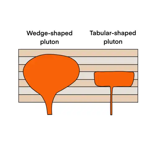 Plutons can be categorised into two types depending on the geometry of the pluton floor. They are called wedged-shape plutons and tablet-shaped plutons.[24] Wedge-shaped plutons typically have irregular shapes. They may have roots that tapers downwards which eventually become cylindrical-shaped feeder structures which cause the floors to dip inward at different angles.[22] Tablet-shaped plutons have parallel pluton floors and roofs, and steeper sides compared to wedge-shaped plutons.[1] Some plutons may exhibit features of the two types.[1]