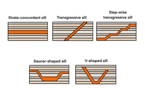 Depending to its shape and concordance to the country rock, sills can be classified into five different types based on field evidence.[26][27] They are strata-concordant sills, transgressive sills, step-wise transgressive sills, saucer-shaped sills, V-shaped sills, and hybrid sills.[26][27] Strata-concordant sills are the classic representation of a sill. They develop continuously and concordantly with the host rock and are often found in deeper part of the upper crust.[27] Transgressive sills cut through and propagate to higher layers with an oblique angle to the host rock, displaying discordant properties.[27] It is straighter in shape. Step-wise transgressive sills are similar to transgressive sills, but there are alternating concordant and discordant segments, producing step-like features.[27] Saucer-shaped sills have a lower central concordant sill, and two higher outer transgressive sills that flatten out at the tips.[27] They usually have a thicker inner sill and thinning outwards.[27] V-shaped sills are somewhat similar to saucer-shaped sills, but it has a shorter inner part. Hybrid sills shows mixed features of the above-mentioned sills.[27]