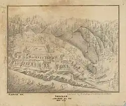 The town is named for its setting in a bowl-shaped valley which early gold miners thought was caused by a volcano.[6] Early-morning fog rising from the valley floor only reinforced that belief. The area was first designated by Colonel Stevenson's men, who mined Soldiers Gulch in 1849. In 1851 a post office was established and by April 1852 there were 300 houses. By 1853 the flats and gulches swarmed with men, and there were 11 stores, six hotels, three bakeries, and three saloons.[7] Hydraulic mining operations, begun in 1855, brought thousands of fortune seekers to form a town of 17 hotels, a library, a theater, and courts of quick justice.[8]