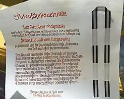 Volksgenosse was formalised in point 4 of the Nazi Party's 25-point Program in 1920 as a racial ideological term: "Only a Volksgenosse can be a citizen. Volksgenossen are only those of German blood, regardless of [religious] denomination. No Jew can therefore be a Volksgenosse".[3][4]