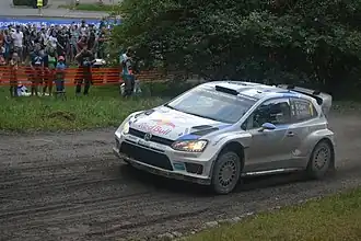 In its debut season, the car scored six wins in its first eight rallies. After finishing second on the Rallye Monte Carlo,[21] Sébastien Ogier went on to win the rallies of Sweden,[22] Mexico,[23] and Portugal.[24] Jari-Matti Latvala scored his first win for Volkswagen in Greece.[25] Following concerns that the cost of moving to a new specification for the 2014 season would drive Ford and Citroën out of the category, Volkswagen successfully lobbied to keep the current car spec for another year.[26] Ogier continued his winning streak with victories in the Rally d'Italia Sardegna,[27] Rally Finland,[28] and had the opportunity to secure the FIA World Rally Championship for Drivers at the Rally Deutschland. However, a mistake on the first leg forced him into retirement, and while he re-entered the following day under the Rally-2 regulations, doing so came with an automatic five-minute time penalty and Ogier finished seventeenth overall.[29] Despite this, Ogier won the rally's power stage, and as a result, would go on to score points in every round of the championship.[30]