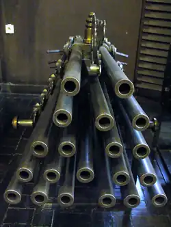 In the mid-1570s a volley gun which was capable of holding from 160 to 320 shots and firing them 4, 8, 12 or 24 bullets at a time, referred to as an 'ingen of war', was presented to the government of England.[2][3] Multi-barreled artillery pieces continued in use during the 16th and 17th century. A double-barreled cannon called Elizabeth-Henry, named after Charles I's youngest children,[4] was used by the Cavaliers during the English Civil War and fired 2oz charges or grapeshot. The barrels were wrapped in leather to prevent rusting.