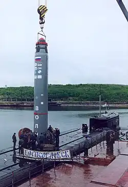 Space launch vehicle Volna (Russian: Волна, lit. 'wave'), is a converted submarine-launched ballistic missile used for launching satellites into orbit. It is based on the R-29R designed by State Rocket Center Makayev and related to the Shtil' Launch Vehicle.[1] The Volna is a 3-stage launch vehicle that uses liquid propellant.[2] The warhead section is used for the payloads that can be either put into orbit with the help of an additional boost engine or travel along a sub-orbital trajectory to be recovered at the landing site. Volna can be launched from Delta III-class submarine or from land based facilities.