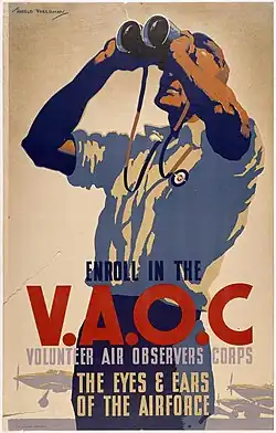 The VAOC was staffed by civilian volunteers and reached an estimated peak strength in 1944 of about 24,000 personnel and 2,656 Observation Posts. After the end of the war, the VAOC was reduced to a cadre in December 1945 before being disbanded on 10 April 1946.