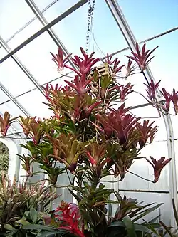 The name "bromeliad" refers to plants in the family Bromeliaceae. More than 2,400 bromeliad species grow worldwide. Bromeliads are commonly epiphytes, which grow by attaching themselves to another surface such as a branch or rock. The conservatory's Bromeliad House features its epiphytes on a special iron display tree holding dozens of different Tillandsia species. The conservatory also displays terrestrial species of the bromeliad family, such as the pineapple (Ananas comosus).