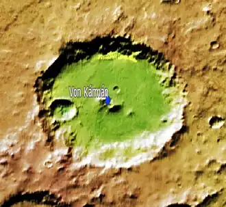 Von Kármán is an impact crater in the Argyre quadrangle of Mars, located at 64.6°S latitude and 58.5°W longitude. It is 90 km (56 mi) in diameter. It was named after Hungarian-American aeronautical engineer Theodore von Kármán.[1]