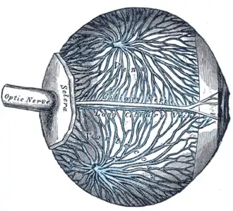 ![]() The veins of the choroid. (Venae vorticosae labeled - though difficult to see - at center.) | |