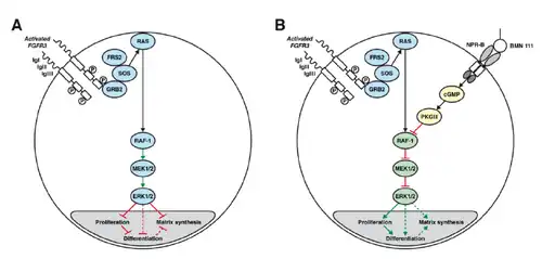 Vosoritide works by binding to a receptor (target) called natriuretic peptide receptor type B (NPR-B), which reduces the activity of fibroblast growth factor receptor 3 (FGFR3).[5] FGFR3 is a receptor that normally down-regulates cartilage and bone growth when activated by one of the proteins known as acidic and basic fibroblast growth factor. It does so by inhibiting the development (cell proliferation and differentiation) of chondrocytes, the cells that produce and maintain the cartilaginous matrix which is also necessary for bone growth. Children with achondroplasia have one of several possible FGFR3 mutations resulting in constitutive (permanent) activity of this receptor, resulting in overall reduced chondrocyte activity and thus bone growth.[10]