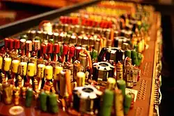 The organ's sound comes from twelve oscillators, one for each note in the chromatic scale along the top octave of the instrument.[4] The signal from each of these is fed into a frequency divider circuit that allows the frequency to be halved, in order to produce the sound an octave lower. This is then halved again for the subsequent octave, and so on down the rest of the instrument's range, except for the lowest note, C, which has a dedicated generator.[10] Each key is connected to four contacts connected to ground; when a key is pressed, it makes a connection to the bus bar which sends a signal to the drawbars to produce a sound.[11]