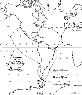 Built by the firm of J. & M. Madigan of Newcastle, Maine, in 1834,[70] the Brooklyn was a full rigged merchantman with a mackerel bow, 125 feet long, 28 feet across the beams, and a 445 ton cargo capacity. Brooklyn's black hull contrasted with a wide, white stripe above the water line, emphasizing faux gun ports, set off by a horn of plenty figurehead beneath the bowsprit.[71][72] Samuel Brannan advertised the chartered vessel in the New York Messenger as "a first class ship, in the best of order for sea... a very fast sailor".[73] However, the voyage occurred at a turning point in maritime capability. The first extreme clipper, the Rainbow, was launched from the Smith and Dimon Shipyard two miles up river from Brooklyn's berth at the Old Slip on the East River,[74] returning from China in an astonishingly short time just months before the Saints sailed. Years later, the Brooklyn was described by passenger James Skinner as a "staunch tub of a whaler",[75][76] Augusta Joyce Crocheron's retrospective account of the voyage said the ship was "old and almost worn out, ...one of the old time build... made more for work than beauty..." Clipper ships were much faster than the older packet ships and merchantmen. Rainbow's successor, the Sea Witch, made an 1850 run from New York around Cape Horn to San Francisco in 97 days. The same route took Brooklyn 5 months 27 days. By far the longest of the Latter-day Saint voyages, Brooklyn's passage from New York took two months longer than passage from Calcutta, India, or Sydney, Australia.[77]