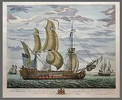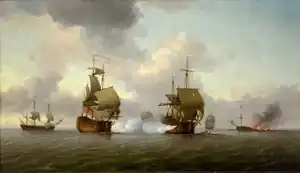 The captain of Dartmouth, James Hamilton, placed his ship next to the Glorioso; nevertheless, after a fierce exchange of fire, Dartmouth's powder magazine caught fire and blew up at 3:30 p.m. Hamilton and most of his crew perished in the flames. Only a lieutenant, Christopher O'Brien, and 11 sailors survived the explosion.[10] Some sources mention 14 survivors from a crew of 300.[11] According to one survivor, HMS Dartmouth was already dismasted and heavily damaged by the Spanish gunfire when a round from Glorioso hit the light-room of the magazine, starting a fire that ignited the powder and blew the ship up. He claimed 15 members of her crew were rescued out of a total complement of 325.[3] These men were saved by life boats from Prince Frederick. The three privateers joined Russell on the following evening and together attacked the Glorioso with all their guns. The Spanish ship resisted from midnight to 9 a.m., when about to sink, almost completely dismasted, without ammunition, and with 33 men killed and 130 wounded on board, de la Cerda, seeing that further resistance was impossible, struck the colours. Russell had 12 killed and several wounded.[12] Another eight men died aboard King George.[2]