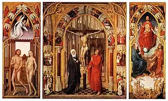Van der Stockt's work was heavily influenced by Rogier van der Weyden, with whom he may have collaborated.[1] Compared to Weyden, his work is "more gently drawn".[1] Although his figures have "slender, elegant, and mannered silhouettes,"[1] he was "unable to endow them with the same elegant movement and profound drama of his master's figures."[3] He would often reproduce motifs from paintings by Van der Weyden with only minor alterations, as is evidenced by Kneeling Donor with Saint John the Baptist, now in the collection of the Allen Memorial Art Museum, in which the figure of the saint closely resembles that in Van der Weyden's Medici Madonna.[4] His Pietà is likewise modelled on van der Weyden's Pietà.[5]