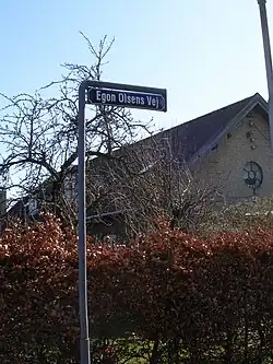When the actor behind the series' protagonist, Ove Sprogøe, died in September 2004 people began talking about whether the road then named Fængselsvej (Prison Road) between Roskildevej and the prison should be renamed after Ove Sprogøe's famous character from the movies, Egon Olsen. After some debate back and forth the name was changed to Egon Olsen Road (Danish: Egon Olsens Vej) by the Municipality of Albertslund. On 21 December 2004, Sprogøe's 85th birthday, the name was officially put in use by the public.