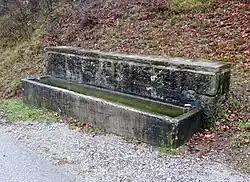 A reservoir and water trough were built at Pri Studencu in 1903 to supply workers building the section of the Bohinj Railway between Dornberk and Štanjel.[4] Tibot Hill is named after Saint Theobald; there are ruins of a church dedicated to saint on the hill.[3][5]