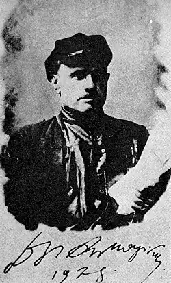 Soon after, he tried to lead an armed uprising of the Piperi and Bjelopavlići tribes, under the slogan "All Power to the Soviets", attacking nearby gendarme stations. Due to a lack of coordination, a part of his rebels surrendered. After that, he set up base in a nearby forest, beginning his guerilla campaign.[2] He spent almost three years in the forests of Montenegro, campaigning against national oppression and reactionary policies in the Kingdom of Yugoslavia.[1] He supported a federal Yugoslavia, with Montenegro as one of its constituent republics.[3] Due to their shared goals and overlapping time frame, Ivo Banac calls his campaign a "Red form of the Green insurgency".[7]