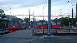 A number of railways pass through the district. The main line between St. Petersburg and Helsinki, the Riihimäki – Saint Petersburg Railway, runs through Vyborg. Another line connecting St. Petersburg and Vyborg follows the coastline of the Gulf of Finland, passing Primorsk. Vyborg is connected to Khiytola via Kamennogorsk. This is the old Vyborg–Joensuu railroad. In Kamennogorsk, a railway branches up north to Svetogorsk; its stretch beyond Svetogorsk to the state border is disused. All these railways are served by suburban trains originating from the Finland Station of St. Petersburg and from Vyborg. In addition, there are daily connections between St. Petersburg and Helsinki.