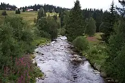 From a water management point of view, the Otava and Vydra are two different rivers with separate numbering of river kilometres. The Vydra is formed by the gradual confluence of several creek with their own names, but the main sources are taken as an integral part of the Vydra. The Vydra originates in the territory of Modrava in the Bohemian Forest mountain range, on the northern slope of the Lusen Mountain (Czech: Luzný), on the Czech-German state border, at an elevation of 1,210 m (3,970 ft).[2] The main source is called Luzenský potok; after its confluence with the Březnický potok, it continues under the name Modravský potok. In the centre of the Modrava village, after its confluence with the Filipohuťský potok and Roklanský potok, the river continues further northward as the Vydra.[1]