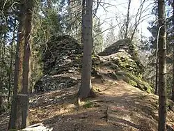 Nístějka is a ruin of a castle in Vysoké nad Jizerou founded probably in the 14th century by the Waldstein family. In 1390, it was acquired together with the settlement of Vysoké by the Vartemberk family and in 1422 by the Jenštejn family. Around 1460, the castle was briefly held by King George of Poděbrady and his goods were attached to Návarov. Since 1519, the castle has been declared desolate, probably after a previous fire.[9]