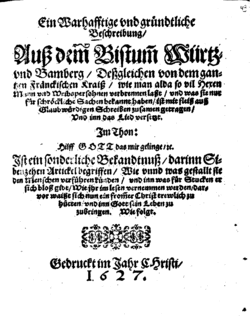 The witchcraft persecutions in Würzburg was initiated by the Reform Catholic and Counter-Reformation Catholic Prince Bishop Julius Echter von Mespelbrunn, Prince Bishop of Würzburg in 1609–1622. In 1612 he incorporated the Protestant city of Freudenburg in the Catholic Bishopric, which resulted in a witch trial with fifty executions.[2] This was followed by a witch trial in Würzburg itself, where 300 people were executed between July 1616 and July 1617,[2] before the persecutions suddenly stopped at the outbreak of the Thirty Years War in 1618.[3]