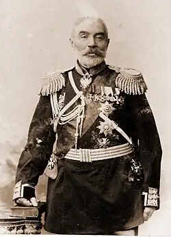 He graduated from the Imperial Nicholas Military Academy in 1842 and reached the ranks of major general in 1863, lieutenant general in 1871 and general of infantry in 1886.[1] He died October 29, 1907, in Warsaw and is buried at the Powązki Cemetery.