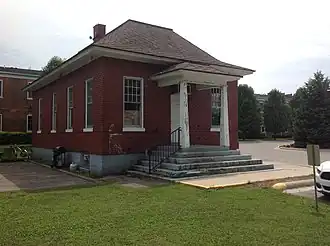 The office building is a single story red brick structure with a hip roof and full basement. The building measures 24 feet by 44 feet. Both the roof eaves and the lower courses of brick flare slightly. The interior of the office building contains a large general office space and a private office with a bathroom behind. The lower level contains another bathroom, a kitchen, an eating area and another office.[3]