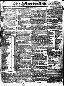 Wentworth returned to Sydney in 1824, accompanied by fellow barrister Robert Wardell.[19] They actively campaigned for the introduction of self-government and trial by jury by establishing The Australian (not to be confused with the present-day paper of the same name), the colony's first privately owned paper. Governor Sir Thomas Brisbane realised there was little point in continuing to censor The Sydney Gazette when The Australian was uncensored and so government censorship of newspapers was abandoned in 1824 and the freedom of the press began in Australia.[20] With an editorial leaning toward the rights of ex-convicts (known as emancipists), the paper was in frequent conflict with Governor Ralph Darling, who attempted unsuccessfully to have it banned in 1826.[21] Wentworth also became a director of the Bank of New South Wales in 1825.[22][23]
