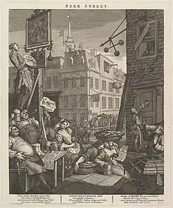 Later prints of significance include his pictorial warning of the consequences of alcoholism in Beer Street and Gin Lane (1751).[43] Hogarth engraved Beer Street to show a happy city drinking the 'good' beverage, English beer, in contrast to Gin Lane, in which the effects of drinking gin are shown – as a more potent liquor, gin caused more problems for society.[44]
