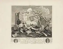 Others works included his ingenious Satire on False Perspective (1754);[70] his satire on canvassing in his Election series (1755–1758; now in Sir John Soane's Museum);[71] his ridicule of the English passion for cockfighting in The Cockpit (1759); his attack on Methodism in Credulity, Superstition, and Fanaticism (1762);[72] his political anti-war satire in The Times, plate I (1762);[73] and his pessimistic view of all things in Tailpiece, or The Bathos (1764).[74]
