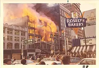 ![]() The W.T. Grant building ablaze, with the Thomas Building (grey) and the Merchants Bank Building (red) in the background. | |