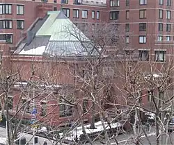 Smith designed the "long-since demolished College of Physicians and Surgeons" of Roosevelt Hospital.[5] He continued his work at the hospital and in 1892 designed the Syms Operating Theater in Roosevelt Hospital, now a teaching amphitheater and the oldest part of the evolving hospital.[6] "'The finest structure in the world for surgical operations,' according to Harper's Weekly," Funding was donated by William J. Syms, a retired gun merchant. It prominently features an 1892 glass roof that lights the operating theater with 184 seats. "The mildly Romanesque building was one where 'beauty of exterior has been sacrificed to utility of interior,' according to Harper's Weekly." Constructed of deep red brick, with granite trim, the building has little decoration, but its unusual great, semiconical skylight on top of a small brick box is memorable. The last operation occurred in 1941. It is still freestanding, even as the tower surrounds it and is now a New York City Landmark.[7]