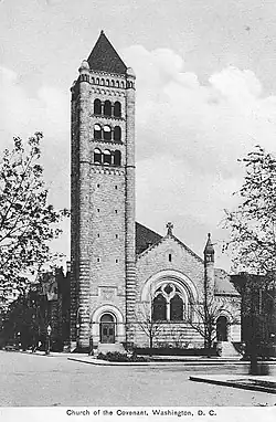 WDM was first licensed on December 22, 1921, to the Church of the Covenant (now The National Presbyterian Church) at 18th and N Streets, N.W., in Washington, D.C., for broadcasting on the standard "entertainment" wavelength of 360 meters (833 kHz).[2] The call letters were randomly assigned, and the station's equipment was constructed by local electrical engineer Thomas J. Williams.[1] (Williams later founded station WPM, which operated for about a year beginning in early 1922). WDM was the first broadcasting station to be established by a religious body.[3]