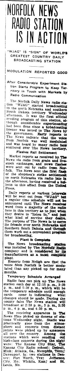 - ^ a b "Norfolk News Radio Station Is In Action", Norfolk (Nebraska) Daily News, September 14, 1922, page 1.