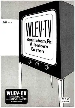 WLEV was, from its beginning, an NBC affiliate and offered most, if not all, of that network's late afternoon and evening programming.[8] The station also carried local programming (as did every other station during this era), including local high school and college sports and the occasional Philadelphia Phillies baseball game.[9][10] The station would take to the airwaves in midafternoon, with the first scheduled show of the day typically beginning at 3 p.m. A short local newscast was aired in the 11 p.m. to midnight hour.[11]