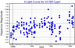 WR 134 is classified as an Algol type eclipsing variable and given the designation V1769 Cygni, but the variation is not strictly periodic and brightness changes occur on timescales of hours to days. It has been investigated several times to search for companions. Morel reported a 2.25 day primary period but considered the variations to be due to rotational modulation rather than the effects of a companion.[11] Rustamov suggests a 1.887 day orbital period with a K-M dwarf companion, but with additional optical variations.[12]