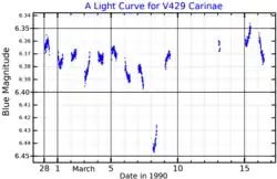 In 1978, Anthony Moffat and Wilhelm Seggewiss announced that the star's brightness varies.[13] Eclipses were first detected by Luis A. Balona et al. in 1989.[14] It received its variable star designation, V429 Carinae, in 1980.[15]