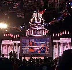 As WWE's June 2011 pay-per-view (PPV) event, which featured wrestlers from the Raw and SmackDown brands, Capitol Punishment replaced the 2010 Fatal 4-Way themed event. Promotion towards for Capitol Punishment was centered around the setting for the PPV, that being the United States capital, Washington, D.C., held at the city's Verizon Center on June 19, 2011.[3][4] WWE produced a video to promote the event using actual press footage of President Barack Obama spliced and edited with footage that WWE recorded using actors. The video was intended to show Obama answering questions about Capitol Punishment in a press conference.[5] First airing on May 22 at Over the Limit, WWE received criticism for the video. To avoid legal complications with the U.S. government, WWE added a disclaimer at the start of the video for future airings. This included spelling out their acronym as "World Wrestling Entertainment",[6] a name they ceased using earlier in the year, in which "WWE" became an orphaned initialism.[7]