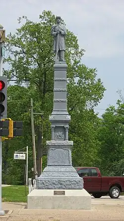 Located adjacent to the courthouse on its southern side is a war memorial featuring a soldier who stands atop a pedestal.[3] Placed during the second half of the nineteenth century,[5] the memorial was temporarily removed for cleaning in 2007, but it was soon returned to its normal place.[3]